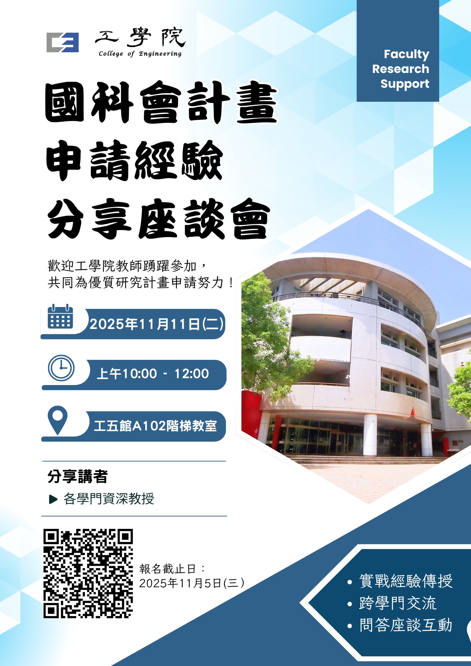 年末國科會計畫申請將近,為協助本院教師熟悉計畫申請流程與撰寫技巧,並促進跨學門經驗交流,工學院將於 2025年11月11日(星期二)上午10:00–12:00 舉辦 「國科會計畫申請經驗分享座談會」。