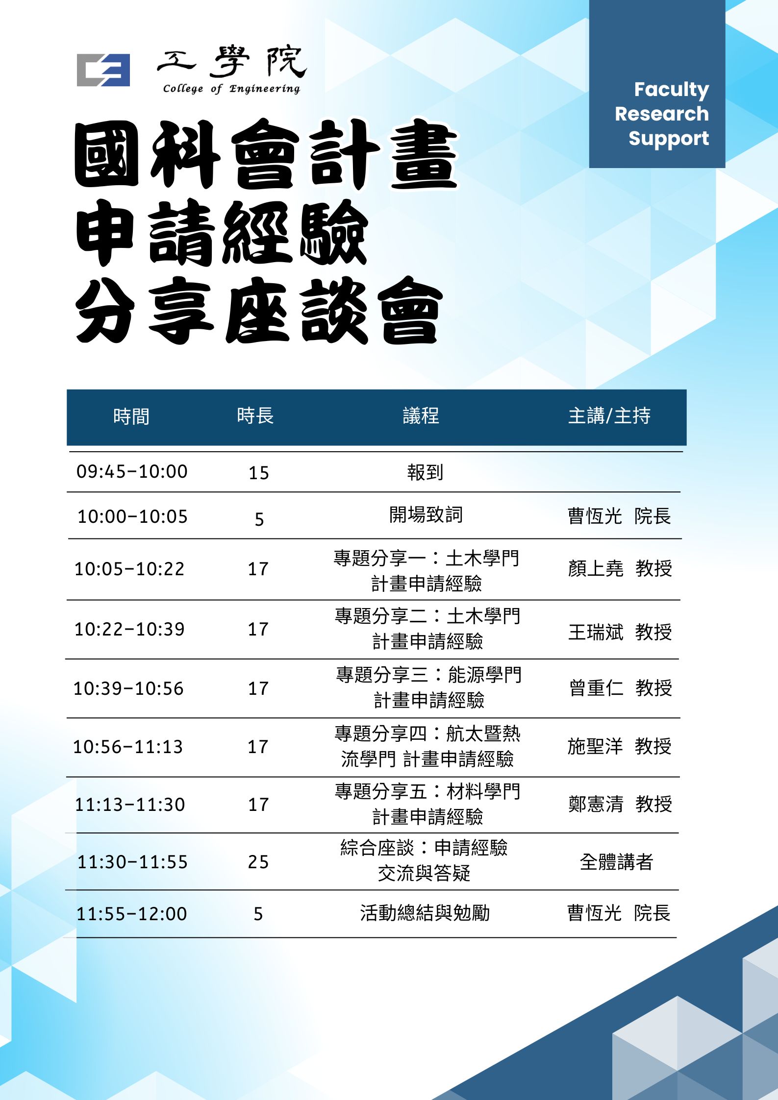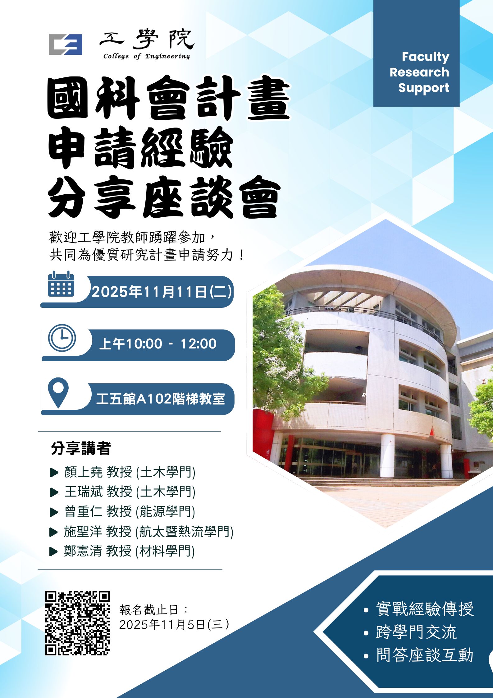 年末國科會計畫申請將近,為協助本院教師熟悉計畫申請流程與撰寫技巧,並促進跨學門經驗交流,工學院將於 2025年11月11日(星期二)上午10:00–12:00 舉辦 「國科會計畫申請經驗分享座談會」。