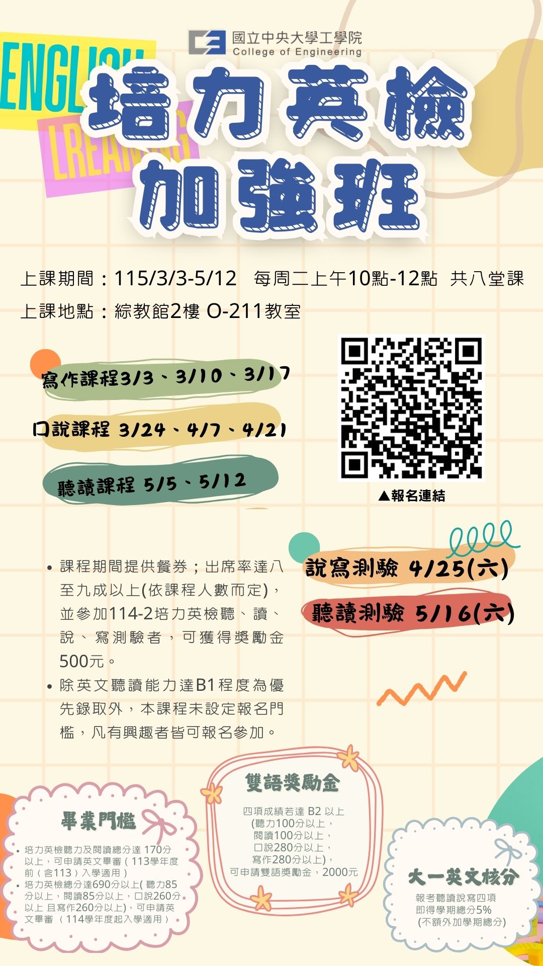 工院好康2:出席率達八至九成以上(依課程人數而定),並參加114-2培力英檢聽、讀、說、寫測驗者(說寫測驗:4/25、聽讀 測驗:5/16、),可獲得獎勵金500元。