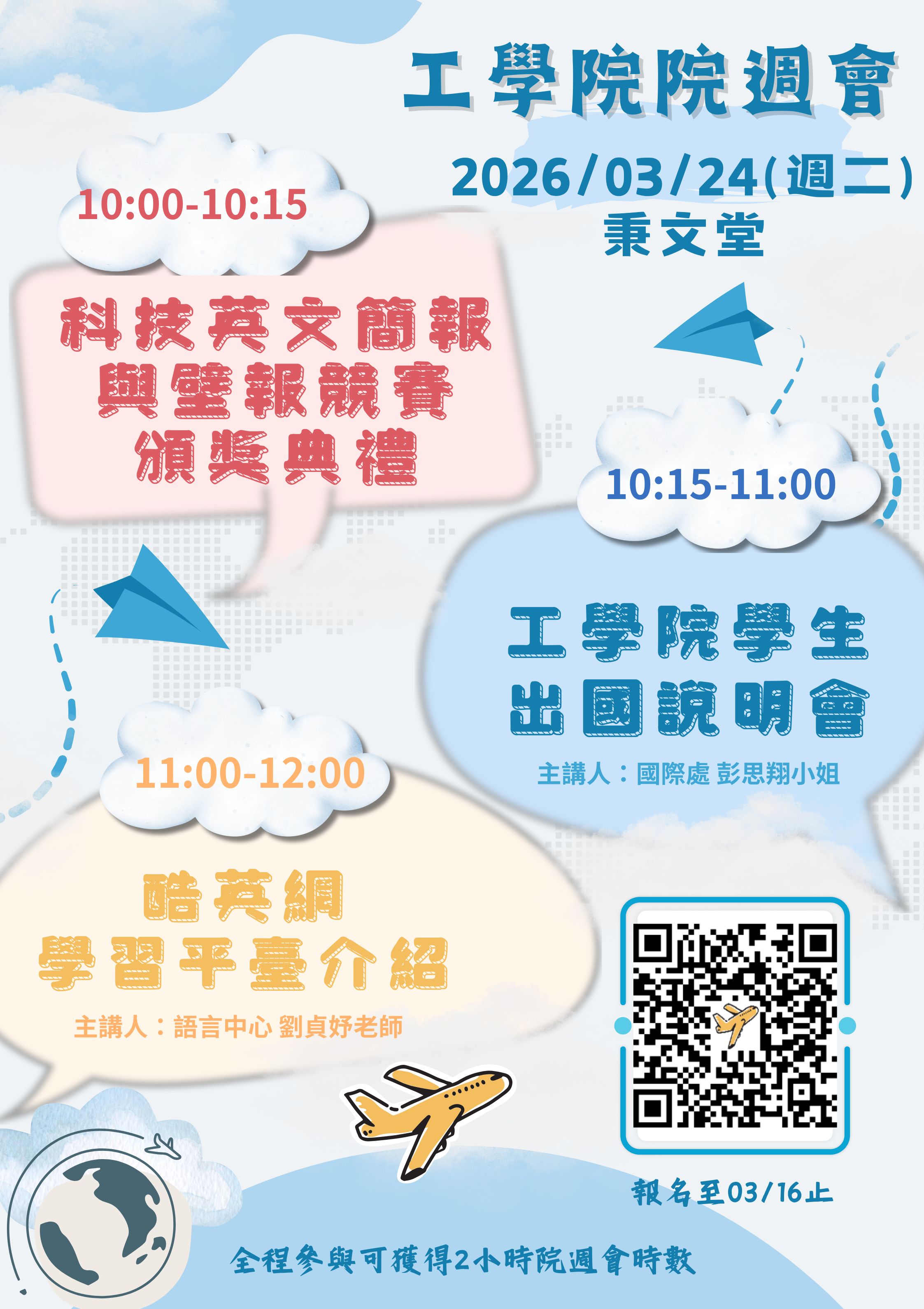讓我們在院週會相聚,一起看見工學院學生的國際力與學習力!
