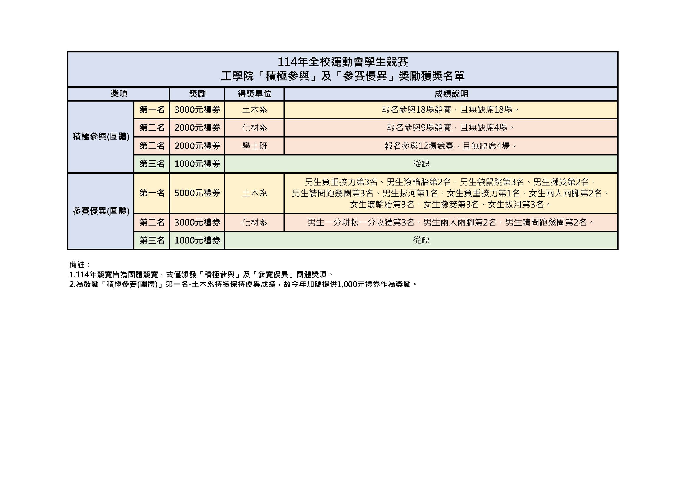 114年中大運動會學生競賽_工學院「積極參賽」與「參賽優異」成績