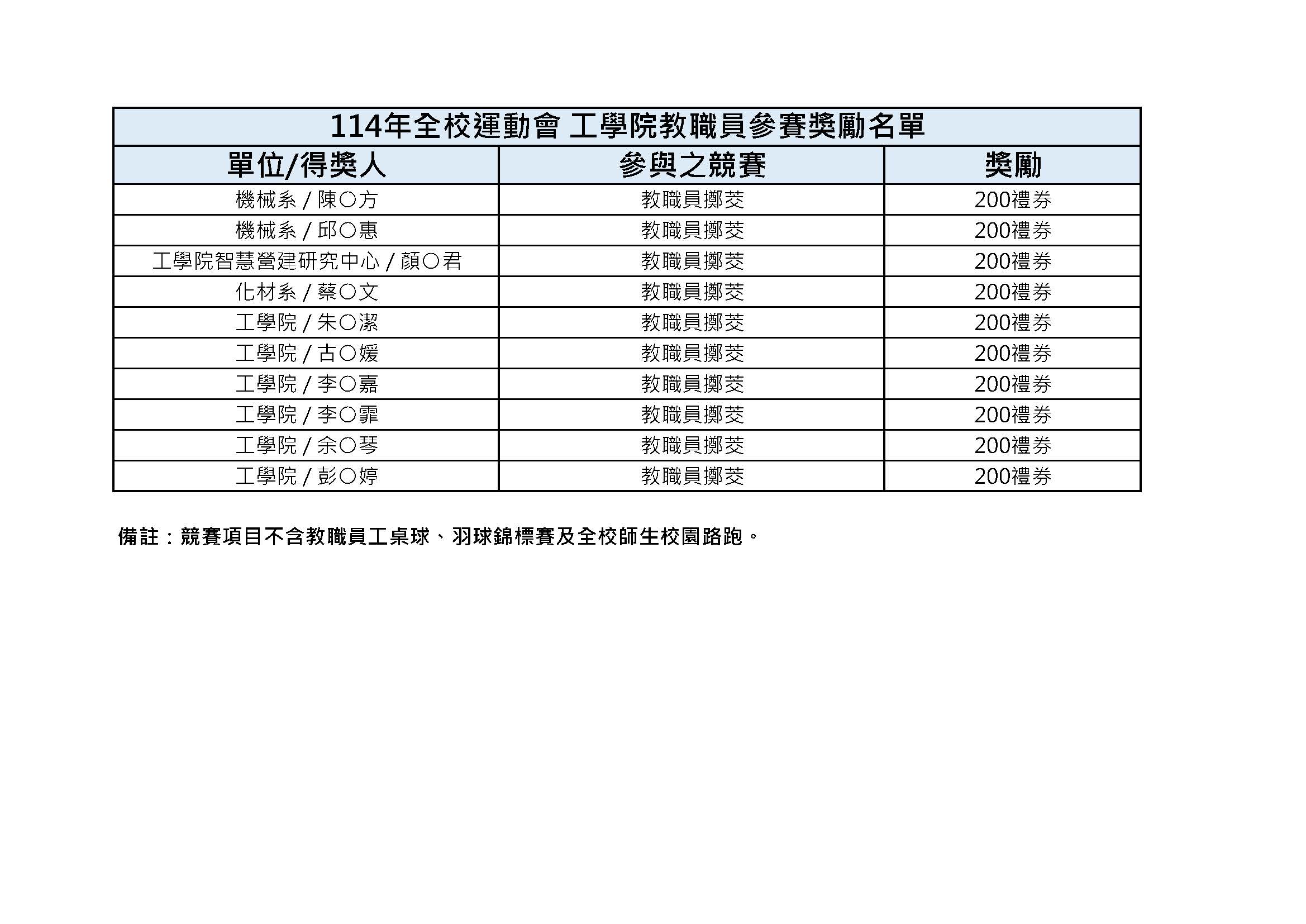 114年中大運動會_工學院教職員工參賽獎勵名單