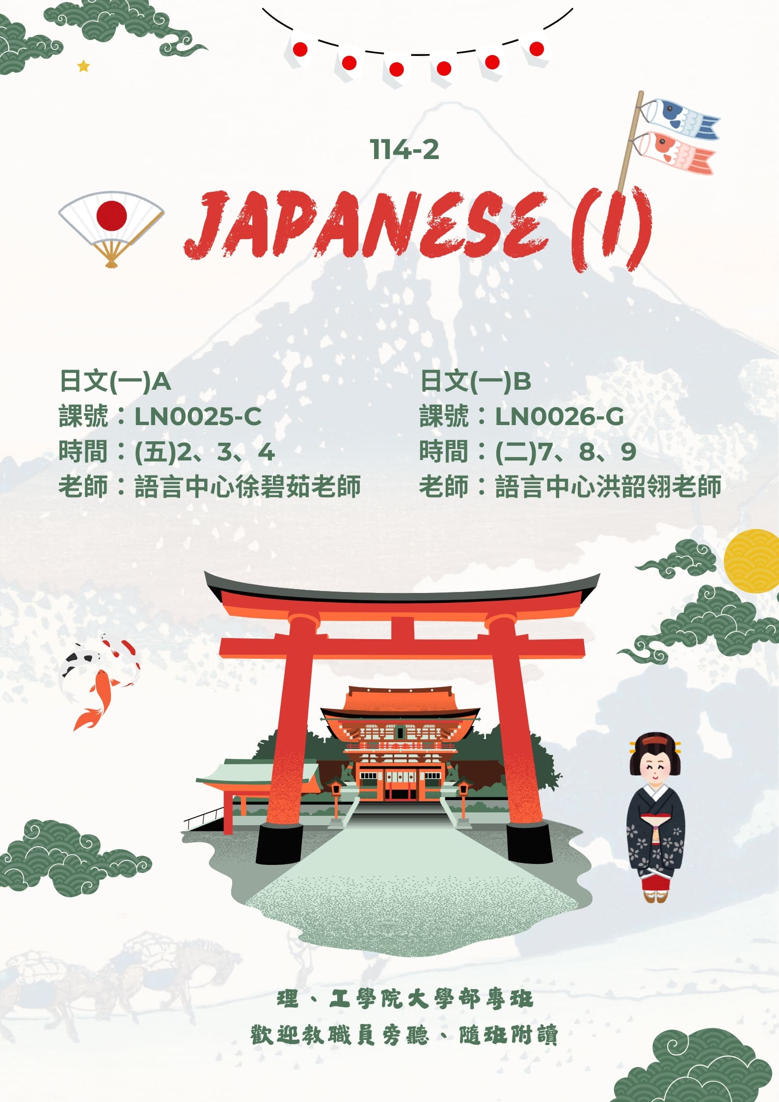 為提升學生日文能力,保障理、工學院學生選上日文課, 114-2學期,工學院與語言中心、理學院持續合作開設【日文(一)A】【日文(一) B】課程!